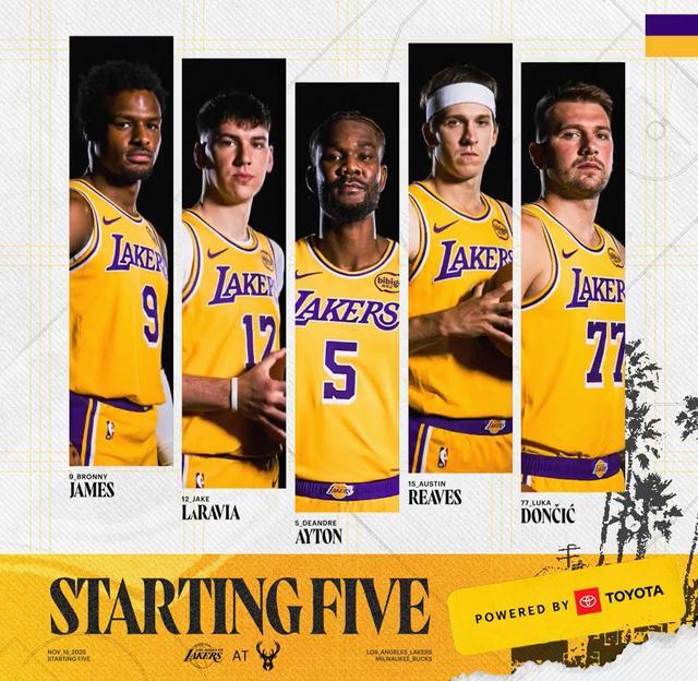 湖人本场首发:布朗尼、拉拉维亚、艾顿、里夫斯、东契奇。